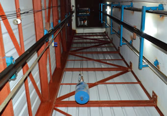 • 電梯防墜落安全裝置主要由三項: 1、防墜安全器 在電梯所有安全裝置失效的情況下,電梯成自由落體狀態,速度也會越來越快,當下降速度達到正常運行速度的1.6倍時,安全器動作,錐鼓鎖死,靠輸出齒輪與齒條制動,同時控制電路斷電。 2、下限位行程開關和三相極限開關 若由于司機操作不當或制動摩擦片磨損嚴重,導致電梯墩底時,下限位行程開關和三相極限開關靠下碰鐵動作,控制電路斷電停車。 3、緩沖彈簧座 為使電梯不致硬性墩底,最下面的緩沖彈簧座可有效促使